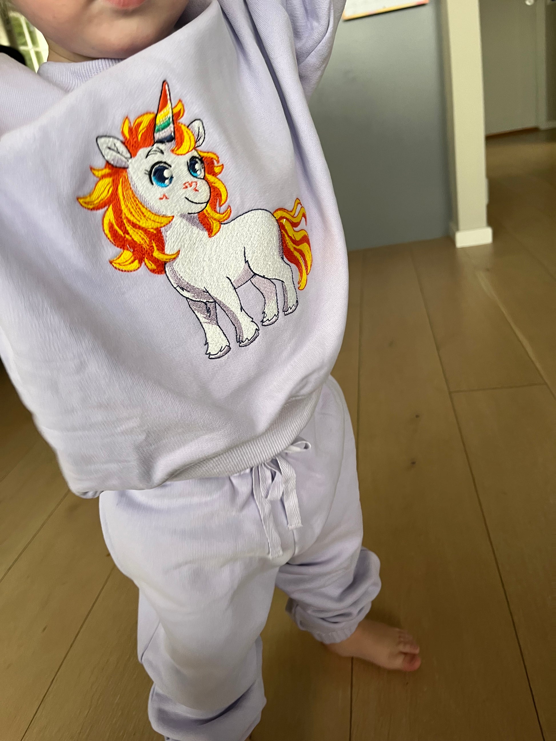 Corny, den magiske enhjørningen som skifter farge etter humøret, gjør denne genseren til en leken og unik del av garderoben.