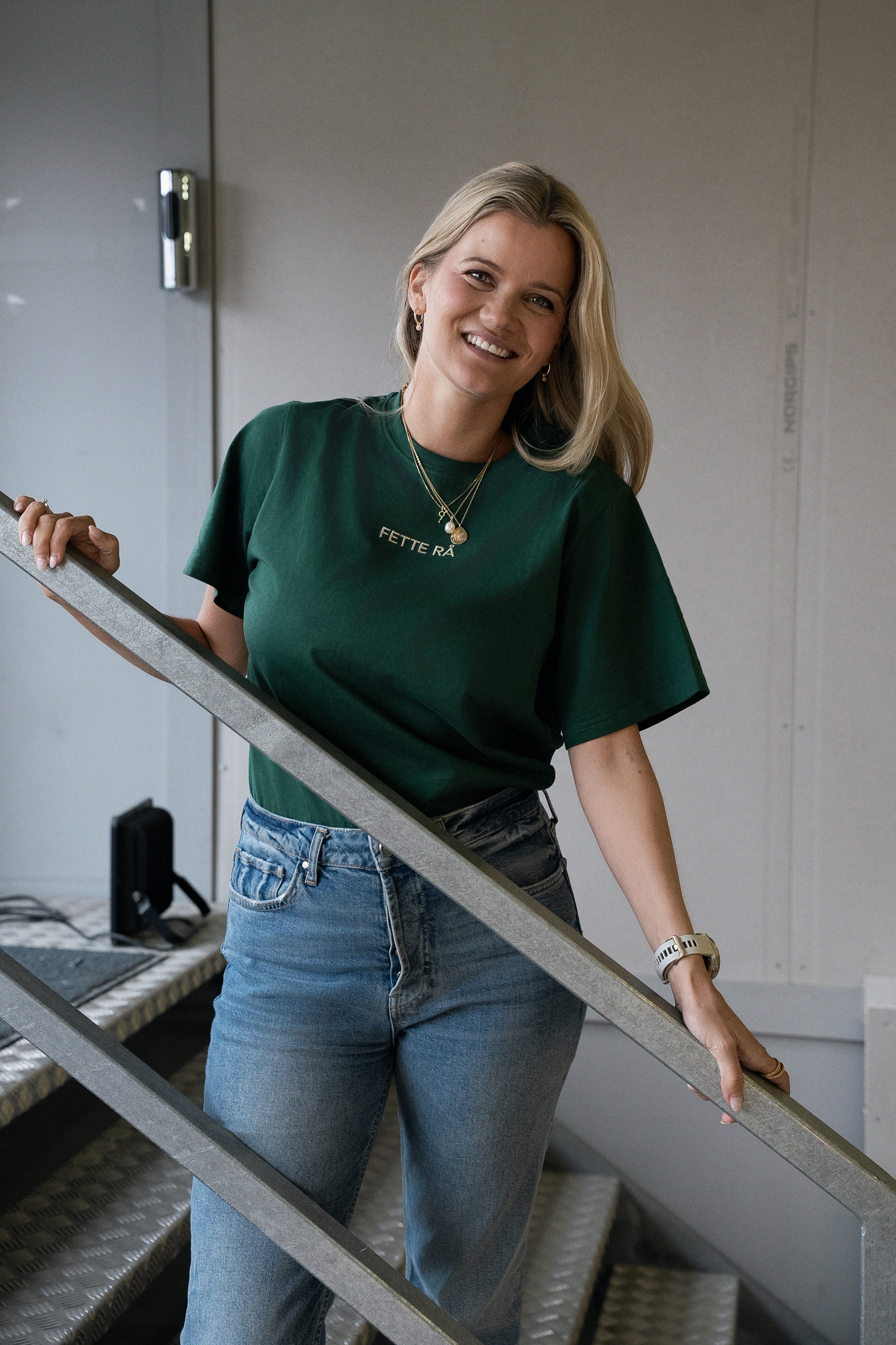 NY FARGE! Grønn T-skjorte med gull brodert tekst på brystet.
