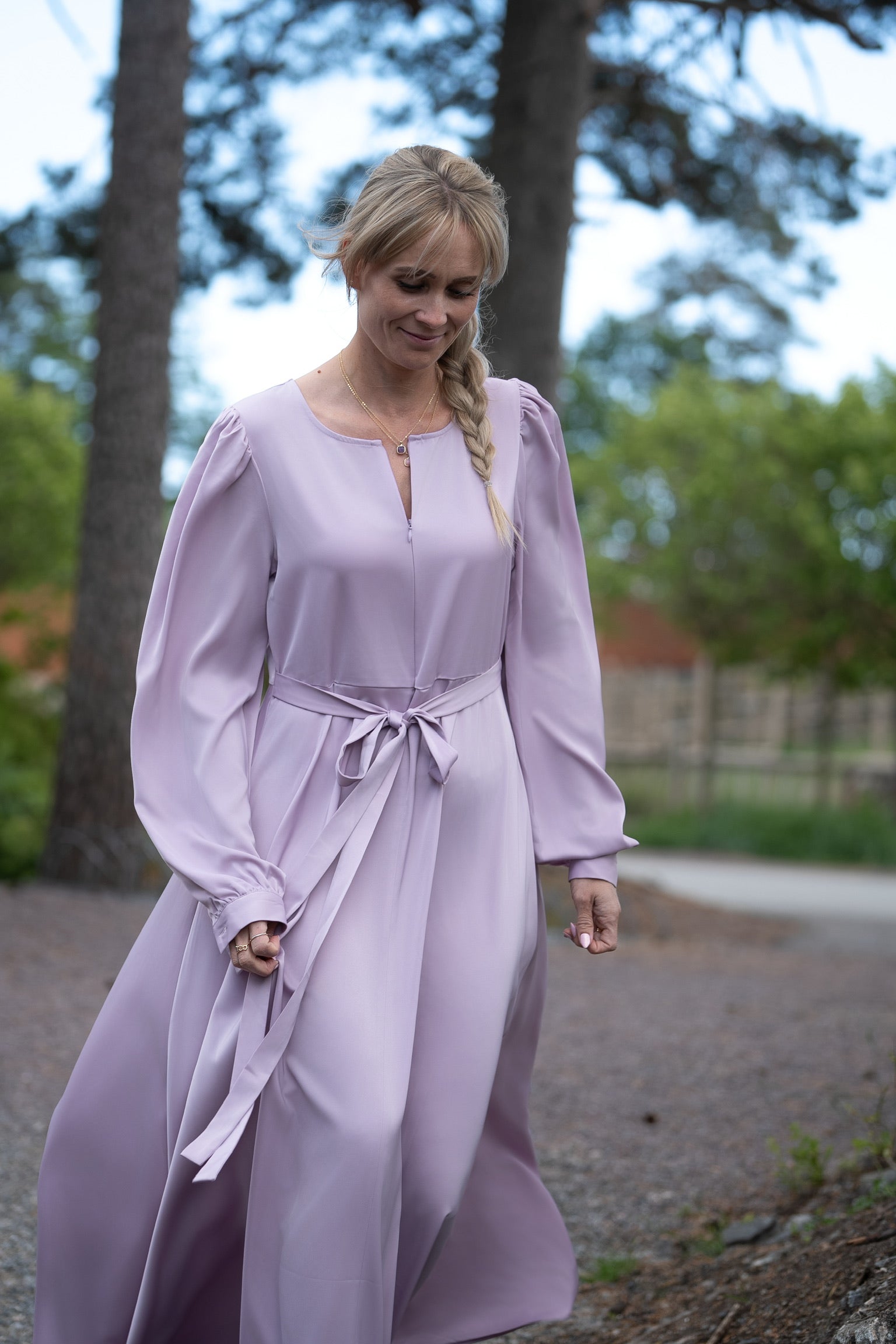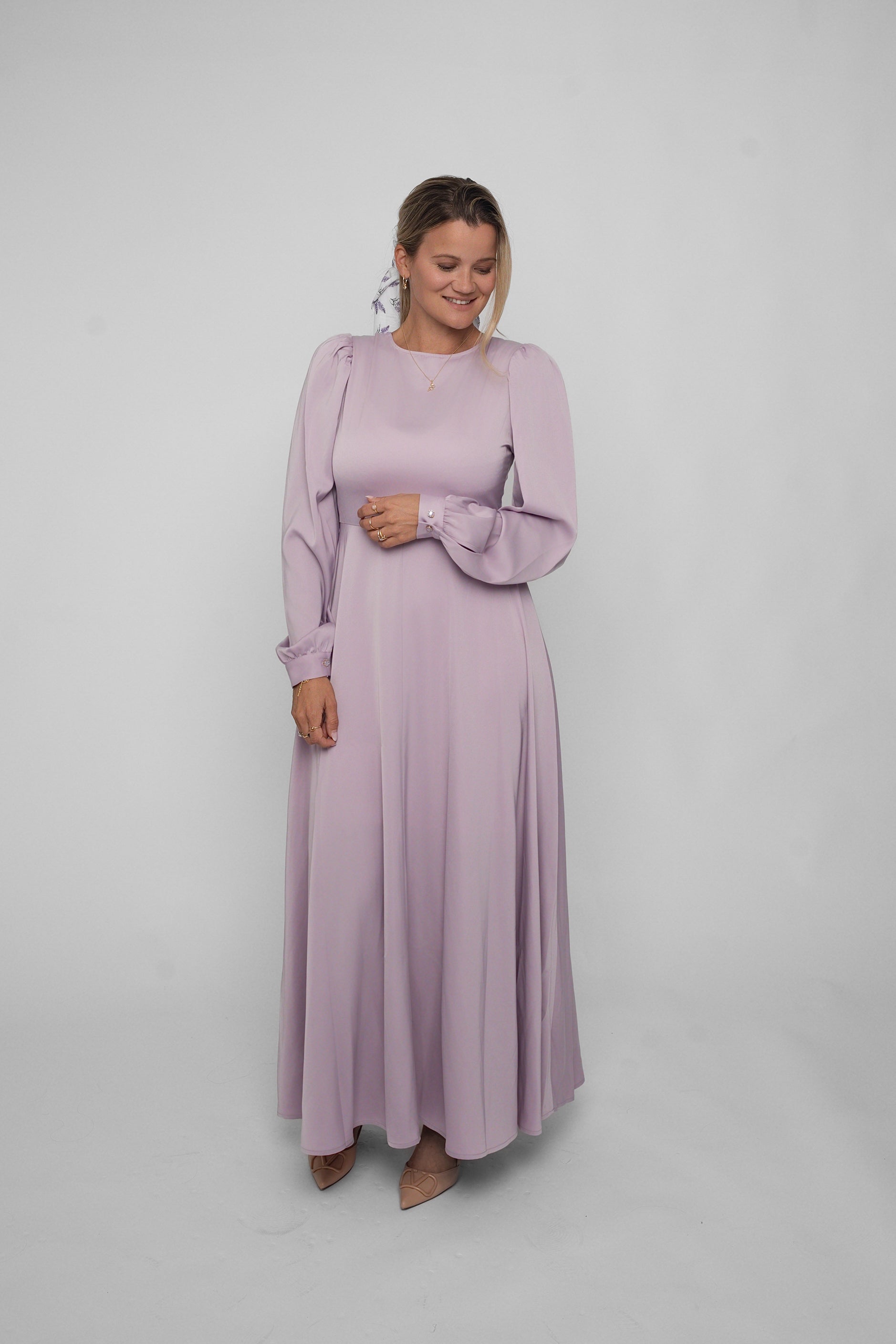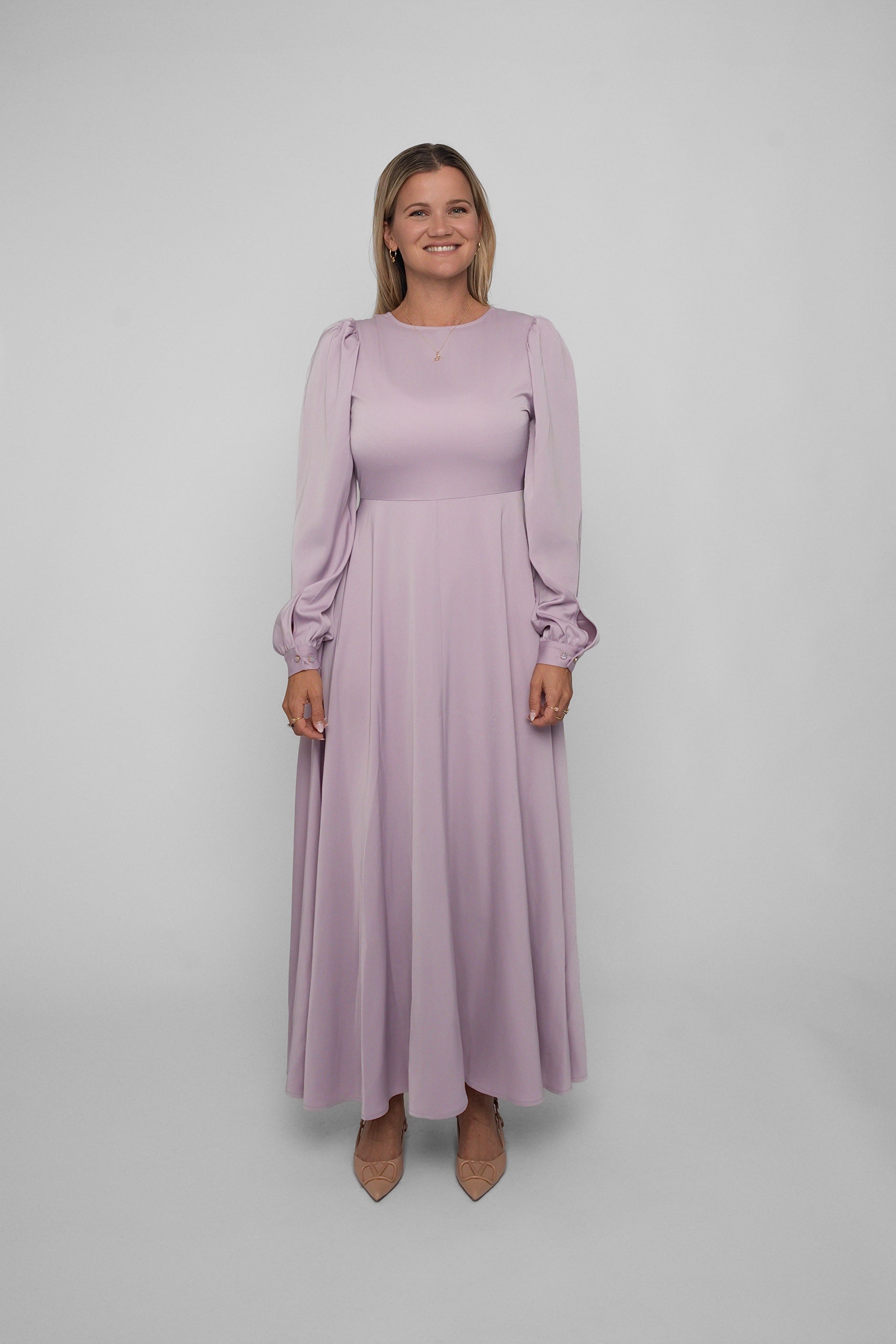 Den glansfulle satengen faller mykt og vakkert rundt kroppen, og gir deg en følelse av luksus – enten du skal i bryllup, dåp, på sommerfest eller bare vil skinne litt ekstra en vanlig dag.
