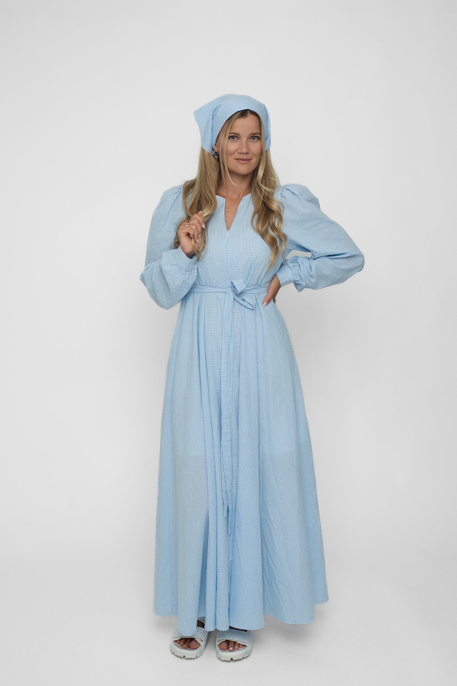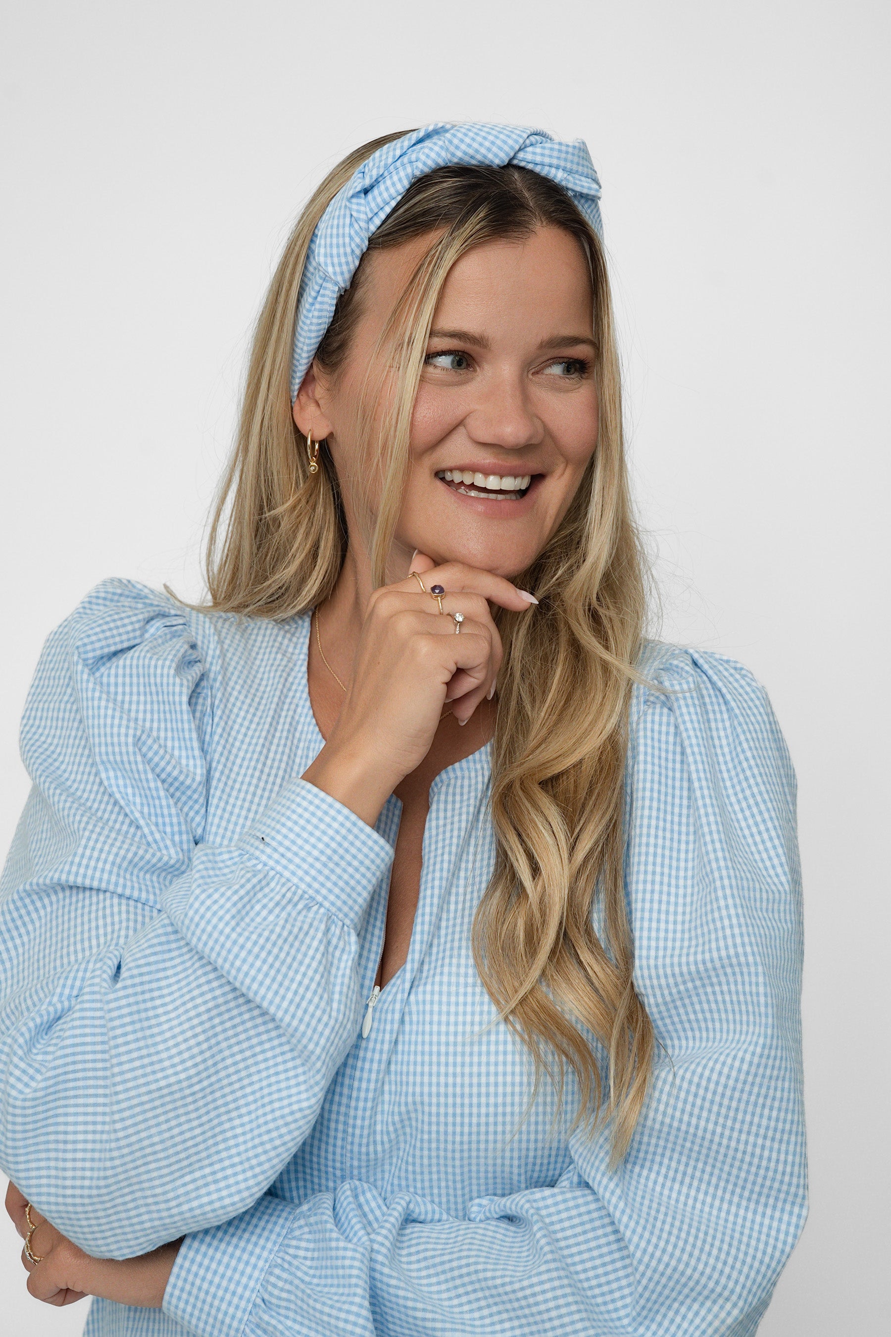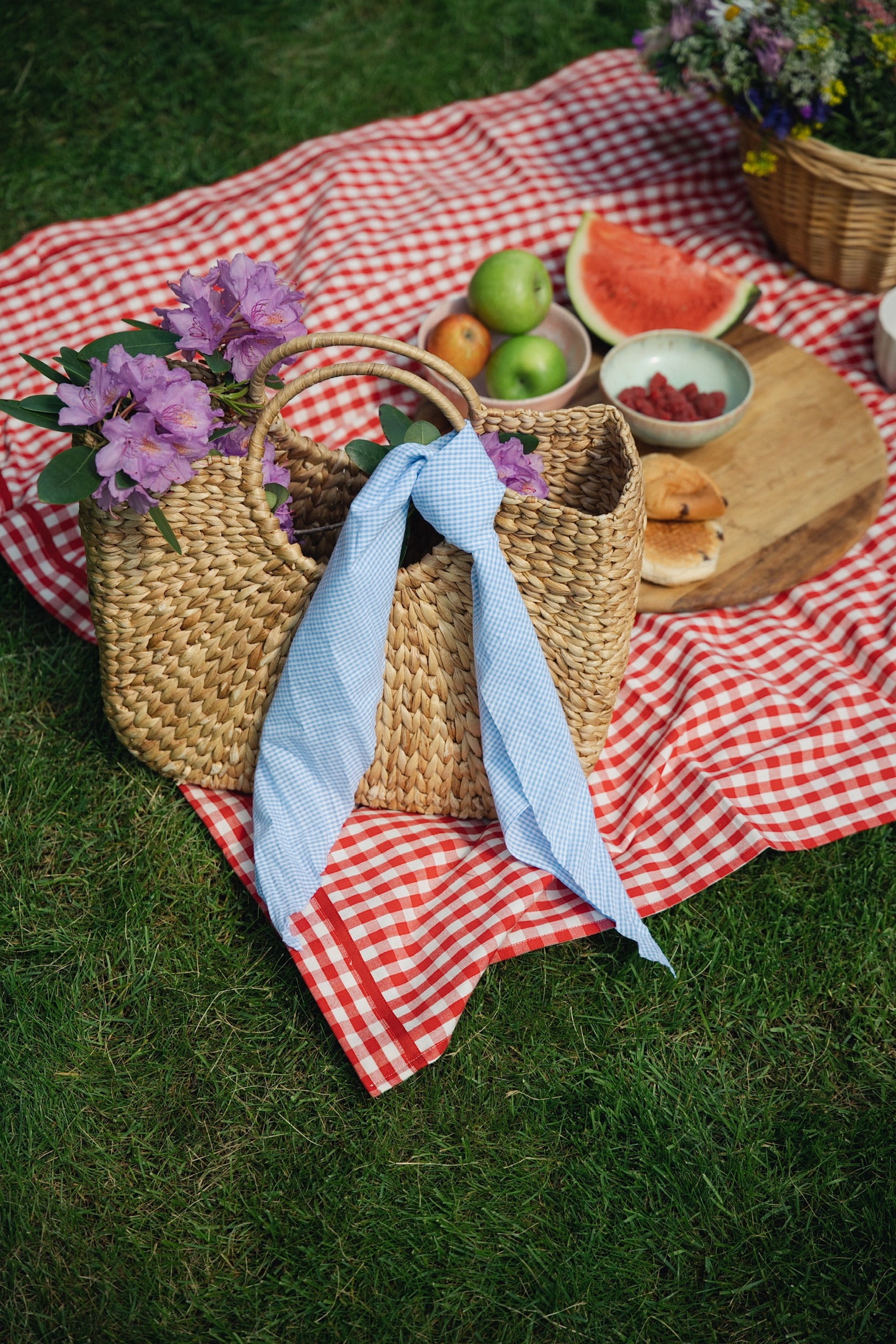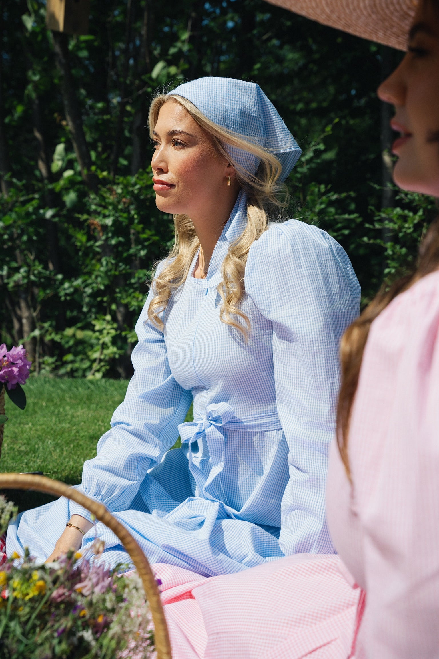 Kommer i blå og rosa gingham – akkurat som kjolen, for et helhetlig og tidløst uttrykk.