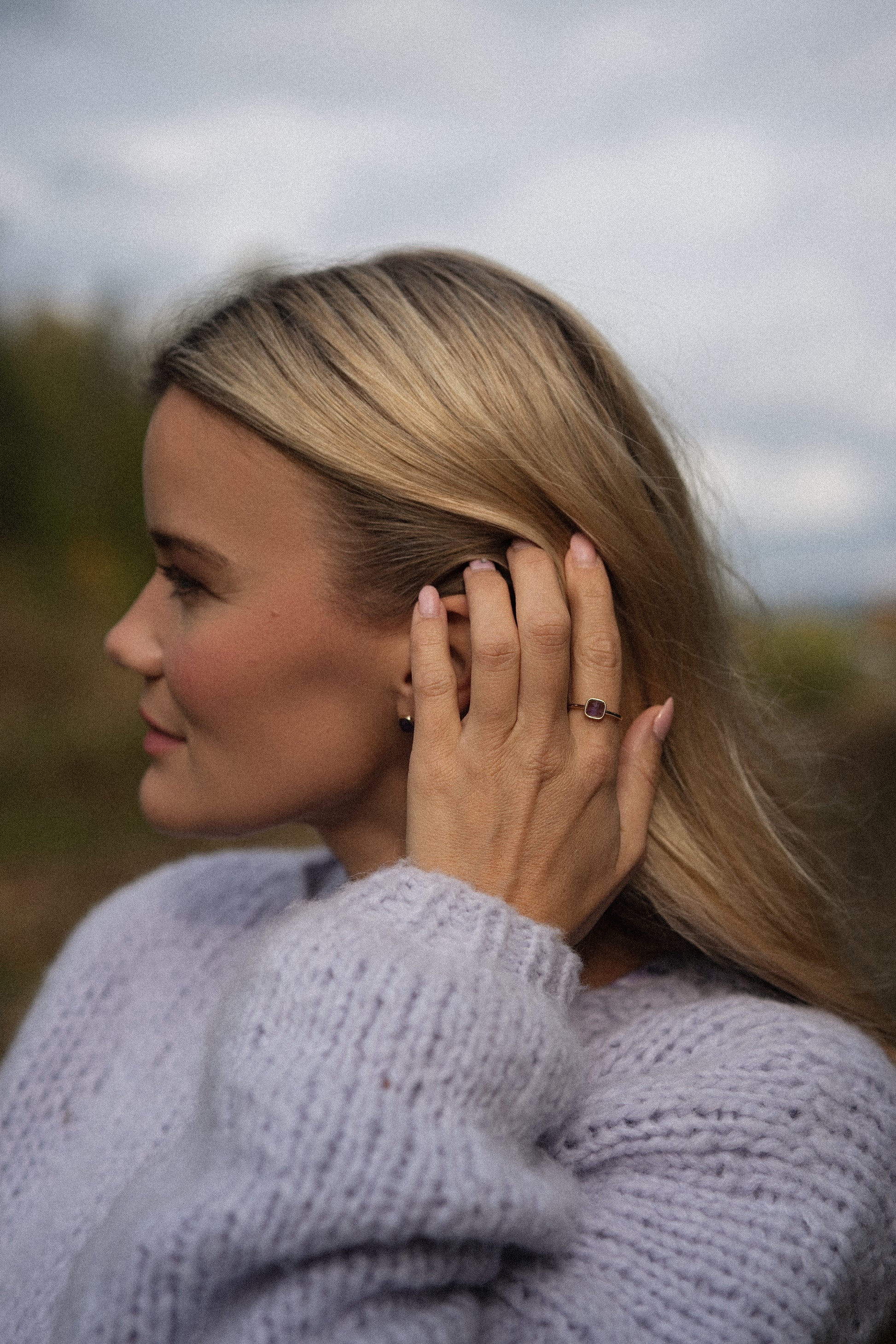 Denne ringen bærer en ametyst – en stein som er assosiert med ro, balanse og klarhet.